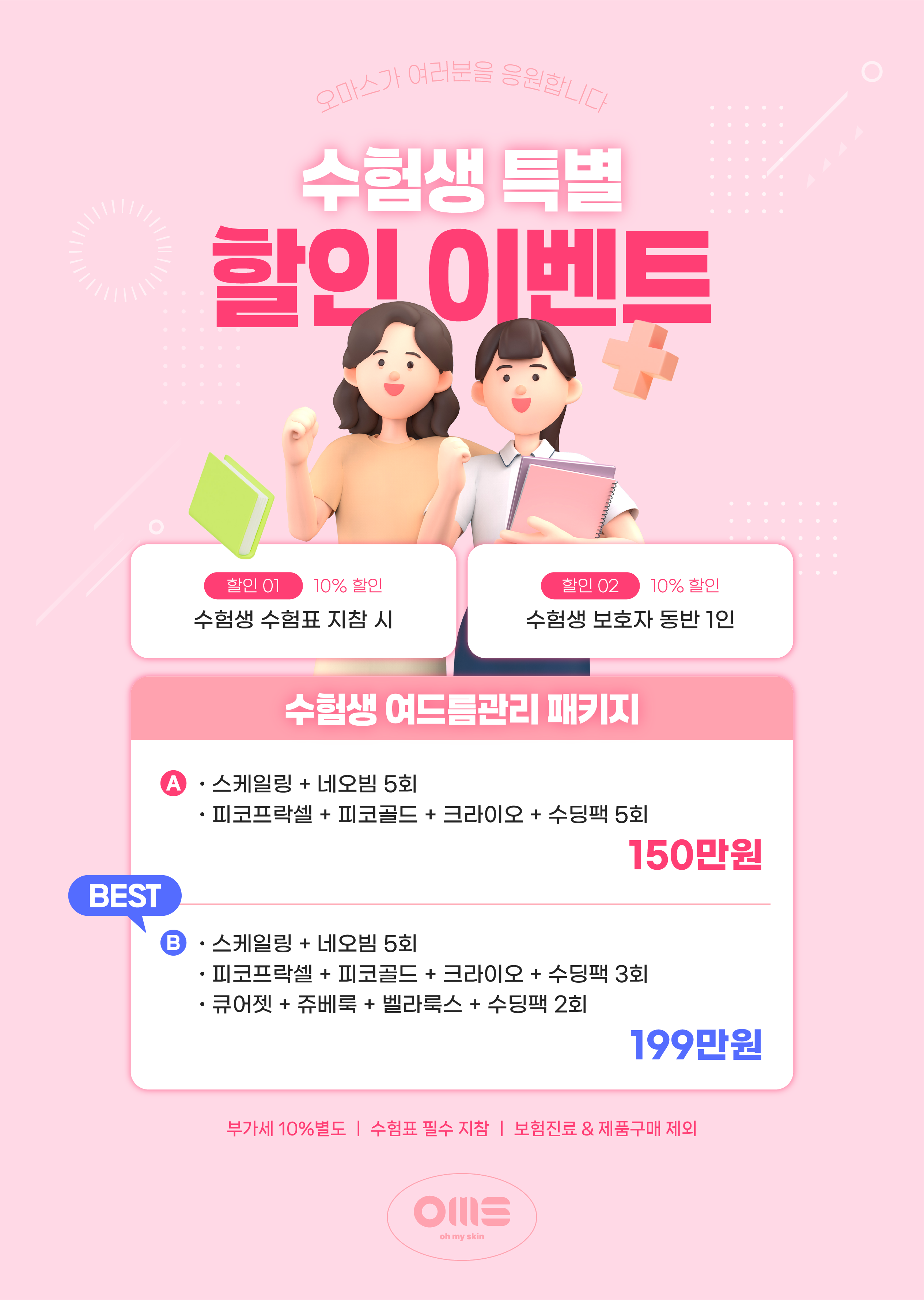 오마스의원 한국어 영어 중국어 일본어 태국어 대만어 베트남어 오마스 이 달의 이벤트를 확인하세요! 이벤트 보러 가기 수험생 특별 할인 이벤트! 오마스가 2026 수능 수험생을 응원합니다! 이벤트 시술 스케일링+네오빔 5회 & 피코프락셀+피코골드+크라이오+수딩팩 5회 1,500,000원 1,500,000원 스케일링+네오빔 5회 & 피코프락셀+피코골드+크라이오+수딩팩 3회 & 큐어젯+쥬베룩+벨라룩 1,990,000원 1,990,000원 수험생) 수험표 지참 시 시술 및 관리 10% 할인 0원 0원 수험생 보호자 동반 시 (1인) 10% 할인 0원 0원