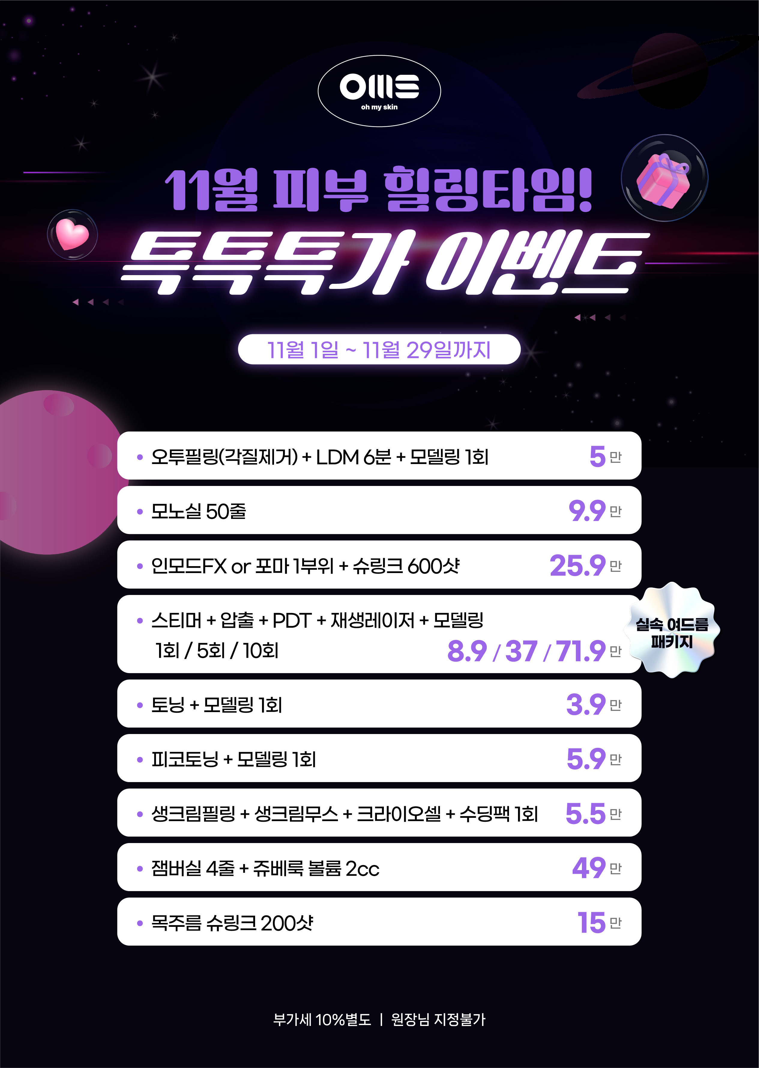 11월 특특특가 이벤트! 11월은 피부힐링타임! 이벤트 시술 오투필링(각질제거)+LDM 6분+모델링 1회 50,000원 50,000원 모노실 50줄 99,000원 99,000원 인모드FX 또는 포마1부위+슈링크 600샷 259,000원 259,000원 토닝+모델링 1회 3만9천 39,000원 39,000원 피코토닝+모델링 1회 5만 9천 59,000원 59,000원 생크림필링+생크림무스+크라이오셀+수딩팩 1회 55,000원 55,000원 잼버실4줄+쥬베룩 볼륨 2cc 490,000원 490,000원 목주름 슈링크200샷 150,000원 150,000원 실속여드름패키지) 스티머+압출+PDT+재생레이져+모델링 1회 89,000원 89,000원 실속여드름패키지) 스티머+압출+PDT+재생레이져+모델링 5회 370,000원 370,000원 실속여드름패키지) 스티머+압출+PDT+재생레이져+모델링 10회 719,000원 719,000원