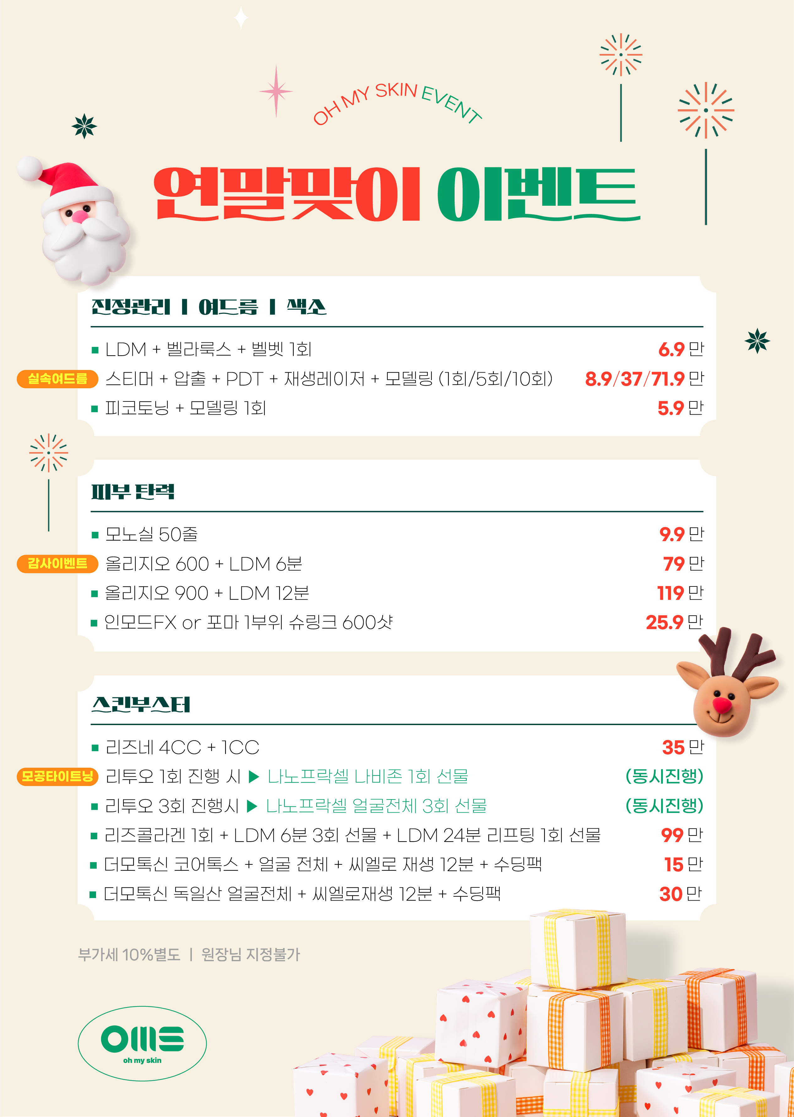 2025 오마스 연말이벤트 오마스 연말이벤트로 빛나게! 이벤트 시술 LDM+벨라룩스+벨벳 1회 69,000원 69,000원 실속여드름) 스티머+압출+PDT+재생레이저+모델링 1회 89,000원 89,000원 실속여드름) 스티머+압출+PDT+재생레이저+모델링 5회 370,000원 370,000원 실속여드름) 스티머+압출+PDT+재생레이저+모델링 10회 719,000원 719,000원 피코토닝+모델링 1회 59,000원 59,000원 모노실 50줄 99,000원 99,000원 감사이벤트) 올리지오 60샷+LDM 6분 790,000원 790,000원 감사이벤트) 올리지오 900샷+LDM 12분 1,190,000원 1,190,000원 인모드fx or 포마 1부위+슈링크 600샷 259,000원 259,000원 리즈네 4+1cc 350,000원 350,000원 모공타이트닝) 리투오 1회 진행시 나노프락셀 나비존 1회 선물(동시진행) 590,000원 590,000원 모공타이트닝) 리투오 3회 진행시 나노프락셀 얼굴전체 3회 선물(동시진행) 1,690,000원 1,690,000원 리즈콜라겐 1회+ LDM 6분 3회 선물+ LDM 24분리프팅 1회선물 990,000원 990,000원 더모톡신 코어톡스 얼굴전체+씨엘로재생12분+수딩팩 150,000원 150,000원 더모톡신 독일산 얼굴전체+ 씨엘로재생12분+수딩팩 300,000원 300,000원