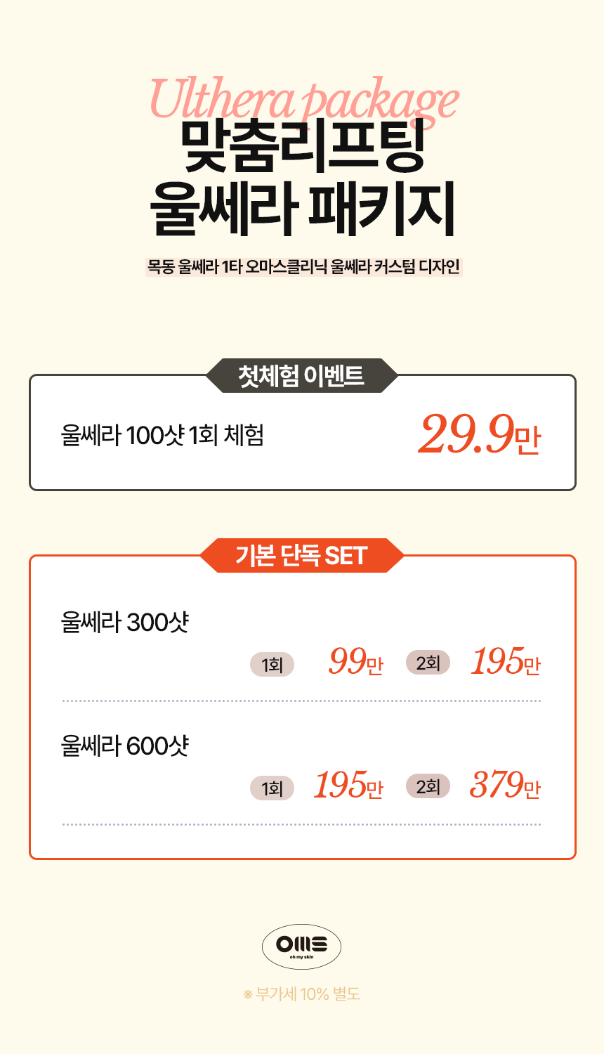 목동 오마스클리닉, 울쎄라 리프팅 울쎄라를 알고만 있던 시간에서 직접 느끼는 시간으로. 첫 체험 29.9만 원 이벤트 시술 울쎄라 100샷 (첫체험가) 299,000원 299,000원 울쎄라 300샷 1회 990,000원 990,000원 울쎄라 300샷 2회 1,950,000원 1,950,000원 울쎄라 600샷 1회 1,950,000원 1,950,000원 울쎄라 600샷 2회 3,790,000원 3,790,000원