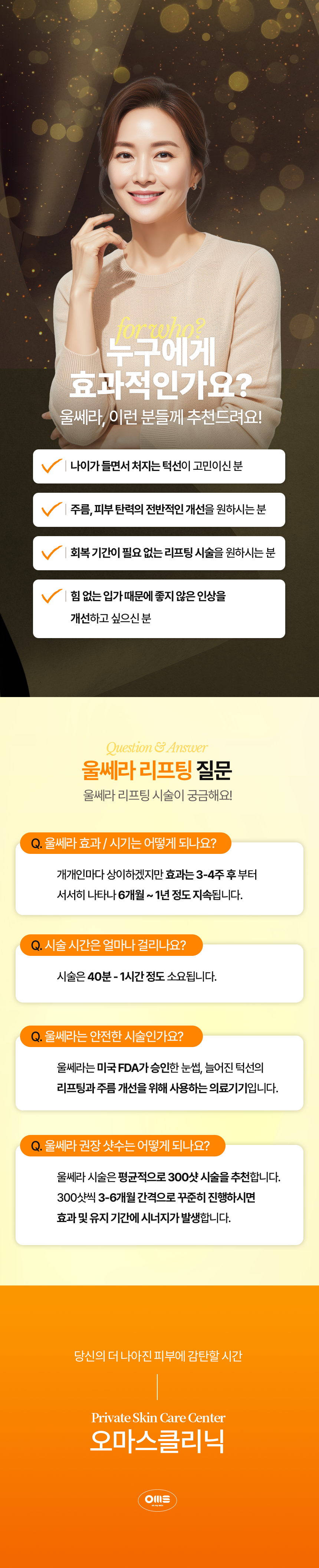 오마스의원 한국어 영어 중국어 일본어 태국어 대만어 베트남어 오마스 이 달의 이벤트를 확인하세요! 이벤트 보러 가기 목동 오마스클리닉, 울쎄라 리프팅 울쎄라를 알고만 있던 시간에서 직접 느끼는 시간으로. 첫 체험 29.9만 원 이벤트 시술 울쎄라 100샷 (첫체험가) 299,000원 299,000원 울쎄라 300샷 1회 990,000원 990,000원 울쎄라 300샷 2회 1,950,000원 1,950,000원 울쎄라 600샷 1회 1,950,000원 1,950,000원 울쎄라 600샷 2회 3,790,000원 3,790,000원